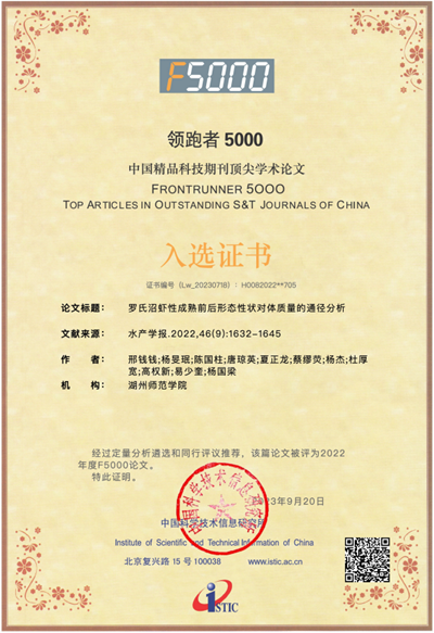 我校研究生学术论文《罗氏沼虾性成熟前后形态性状对体质量的通径分析》入选“领跑者5000——中国精品科技期刊顶尖学术论文”(简称“F5000”)名单。“F5000”是由国家科技部主导、中国科学技术信息研究所建设,集中展示我国精品科技期刊上发表的最高端学术研究成果,在国内具有极高的学术影响力。入选论文要求为各学科前1%的高被引论文,且为原创的科学研究或技术创新成果,能够反映期刊所在学科领域的最高学术水平。